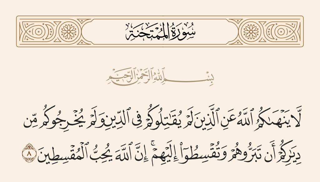 لَا يَنْهَاكُمُ اللَّهُ عَنِ الَّذِينَ لَمْ يُقَاتِلُوكُمْ فِي الدِّينِ وَلَمْ يُخْرِجُوكُمْ مِنْ دِيَارِكُمْ أَنْ تَبَرُّوهُمْ وَتُقْسِطُوا إِلَيْهِمْ إِنَّ اللَّهَ يُحِبُّ الْمُقْسِطِينَ