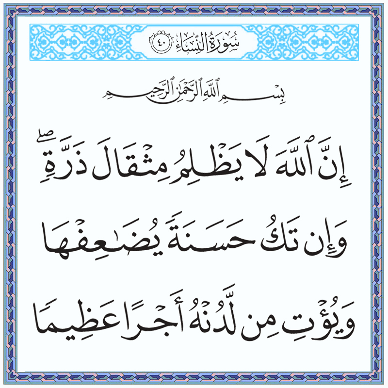 اِنَّ اللّٰهَ لَا يَظْلِمُ مِثْقَالَ ذَرَّةٍ ۚوَاِنْ تَكُ حَسَنَةً يُّضٰعِفْهَا وَيُؤْتِ مِنْ لَّدُنْهُ اَجْرًا عَظِيْمًا